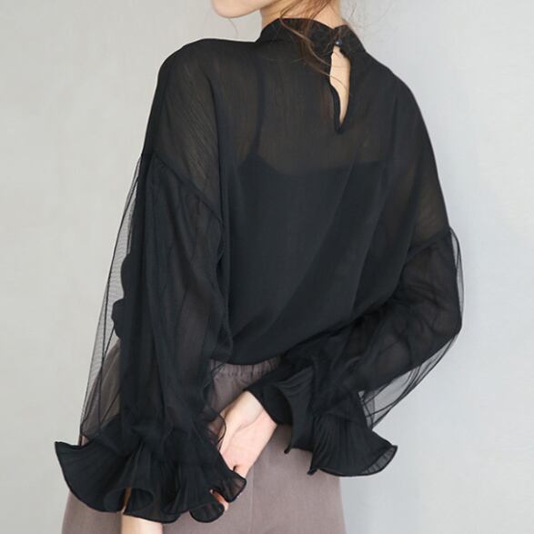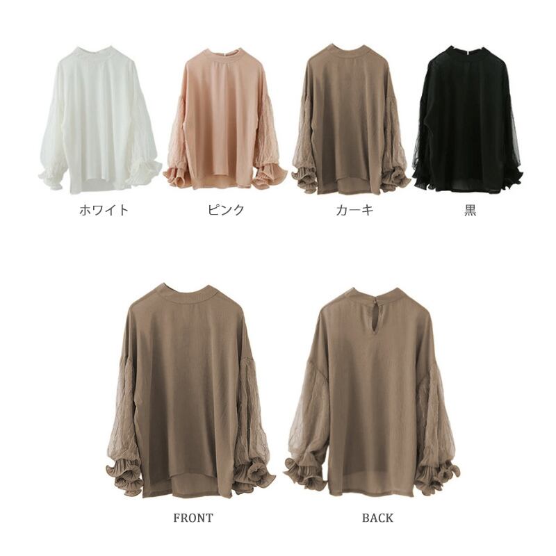 レディース カットソー シフォン トップス プルオーバー 透け感 シースルー レース ボリューム袖