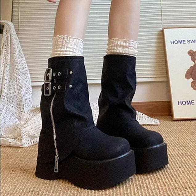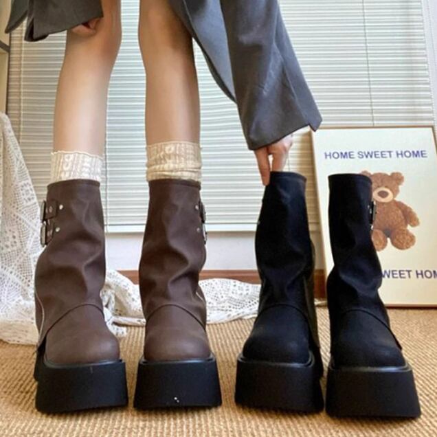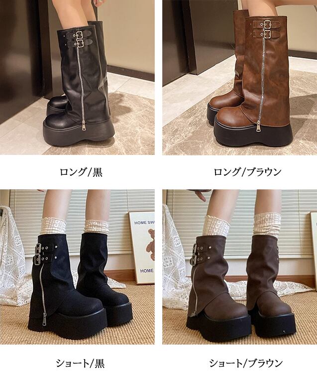 ・ボリュームのある厚底、ワイルドなカバーが目を惹くロングブーツ。