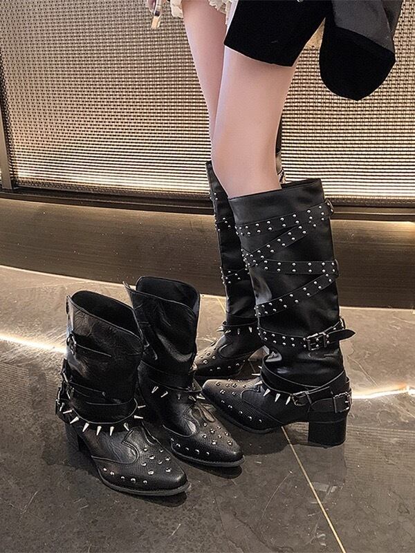 ブーツ ミドルロング スタッズ ベルト PU フェイクレザー 厚底 レディース