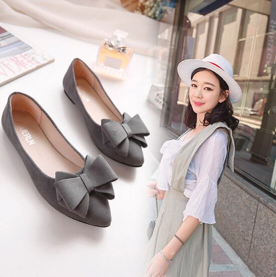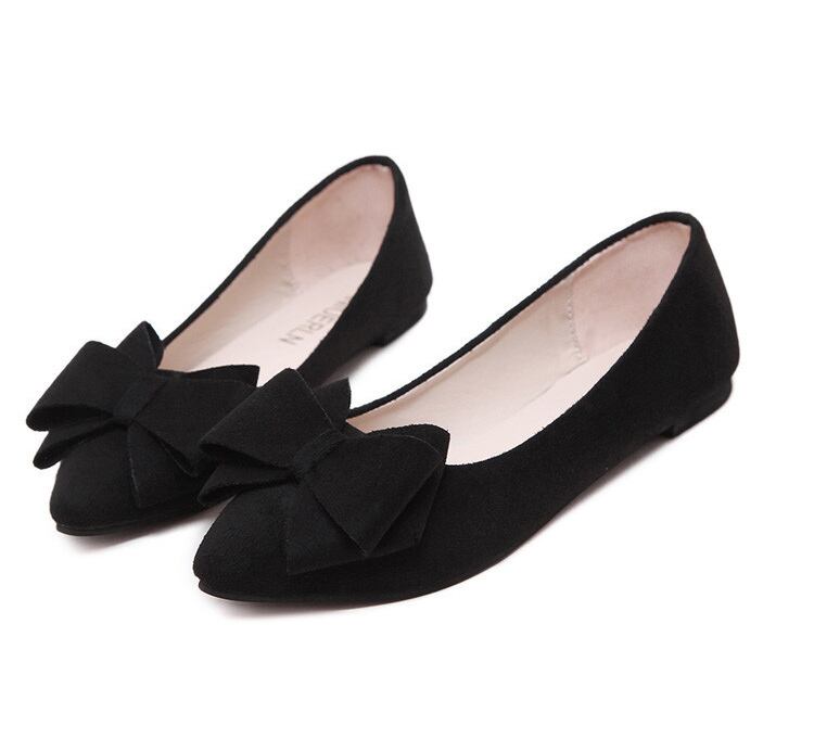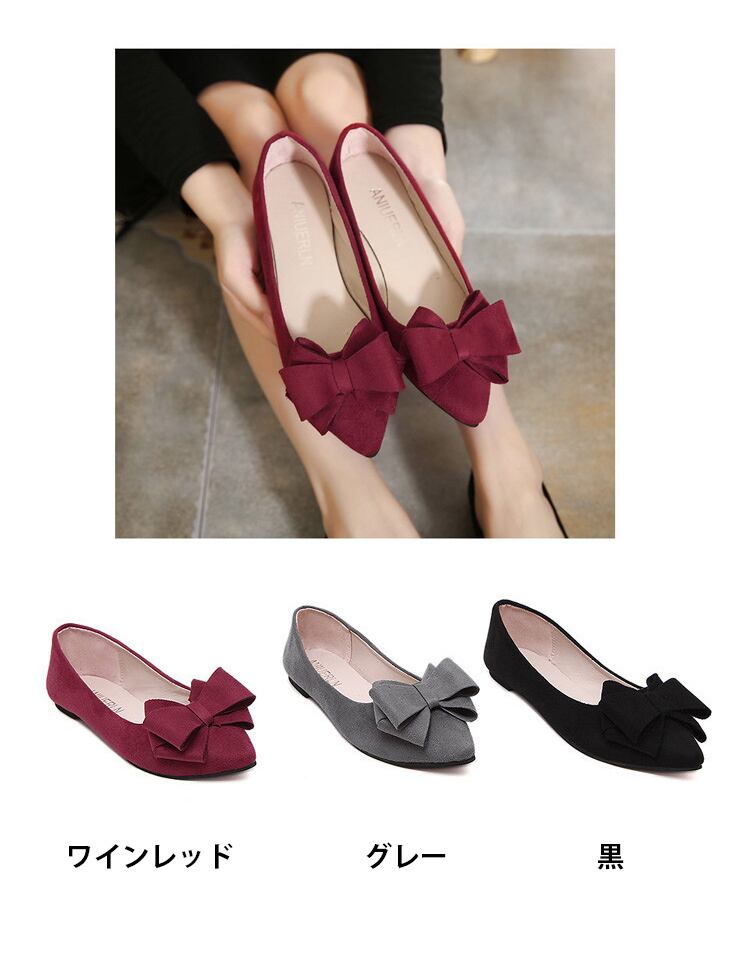 レディース ヒール 楽ちん パンプス ローヒール スエード調 アッパー装飾 リボン フラット