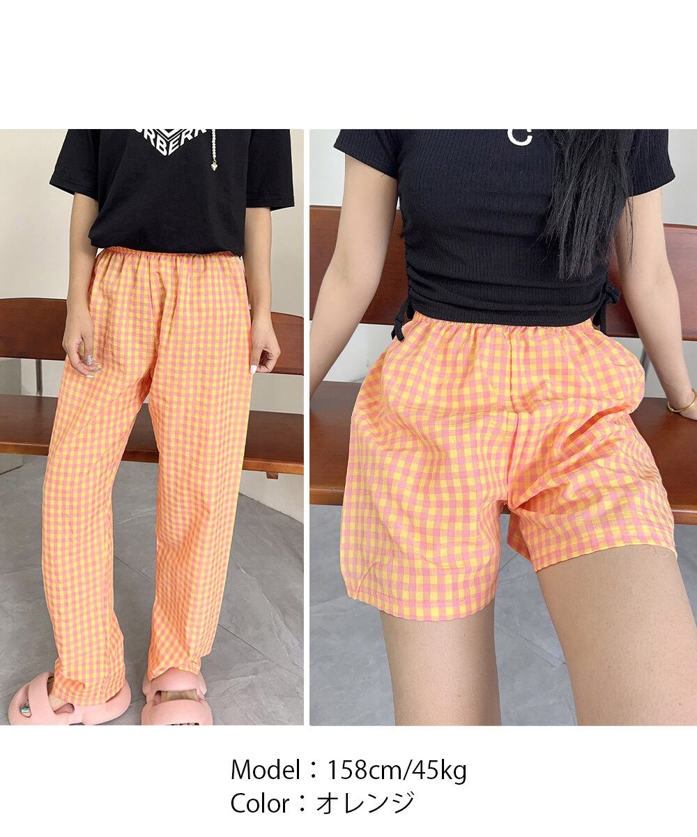 丈選べる チェック柄ロングパンツ涼しい 格子柄ショートパンツ ウエストゴム 着やせワイドパンツ 体型カバー 部屋着パンツ