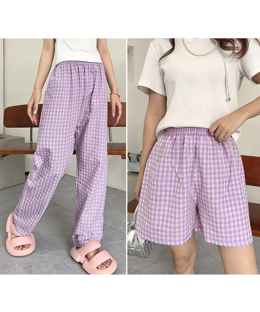 夏にぴったりな軽やかチェック柄パンツ、ショートとロングの2タイプから選べる。