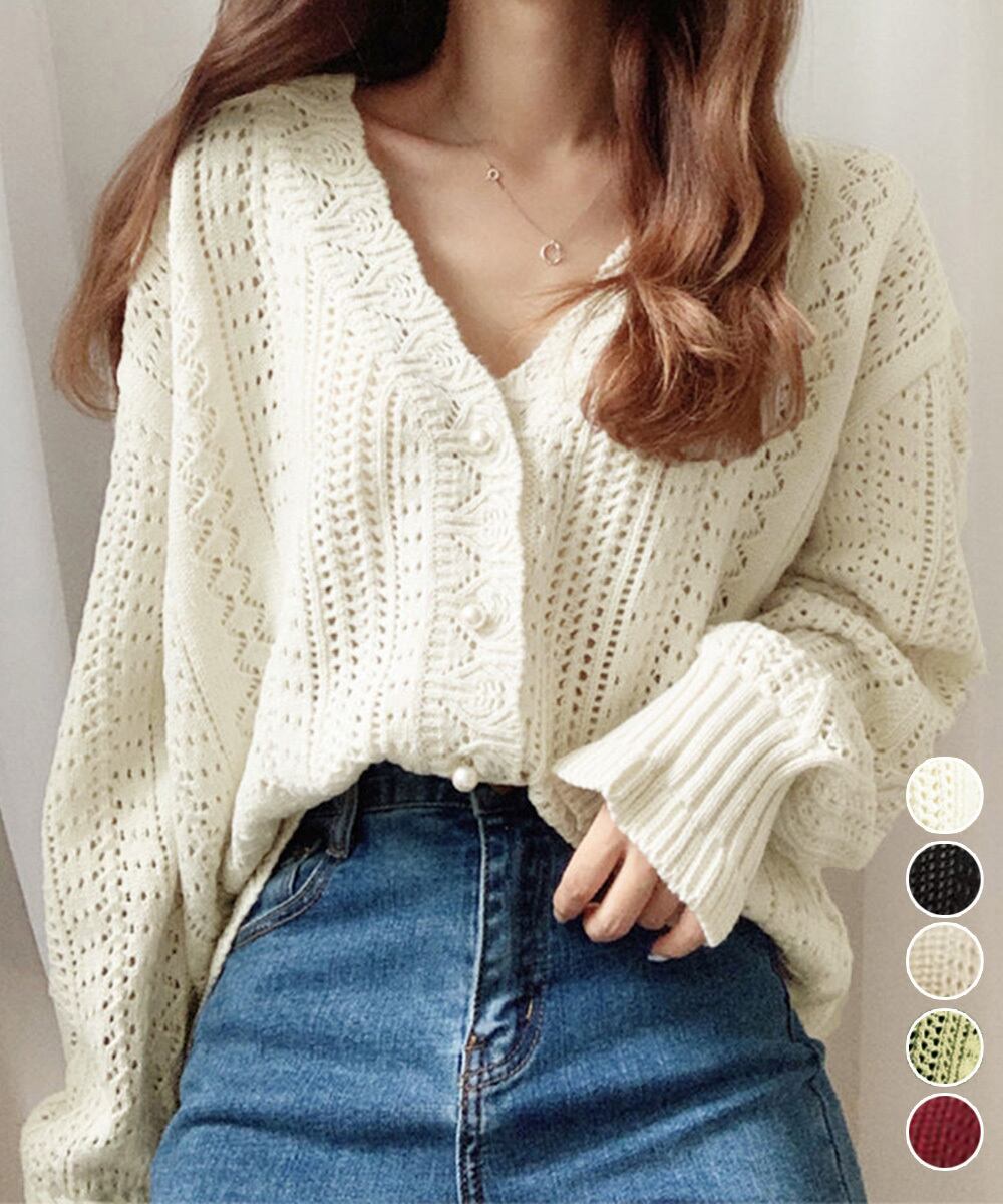 春夏はもちろん、秋にも活躍するゆったりシルエットの透かし編みニットカーディガン。