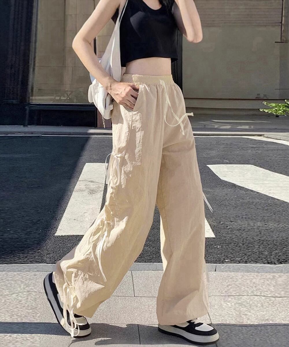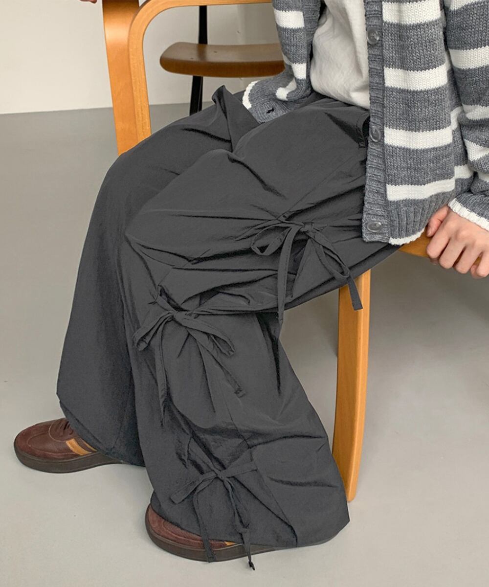 サイドリボンがアクセントになった、ラフなムード漂うカーゴ風ワイドパンツ。