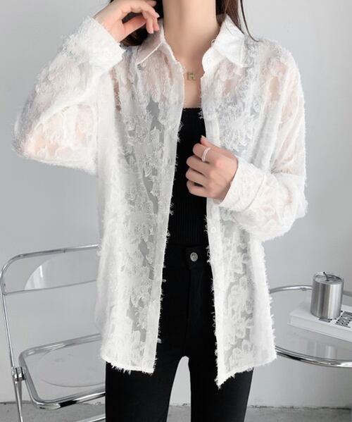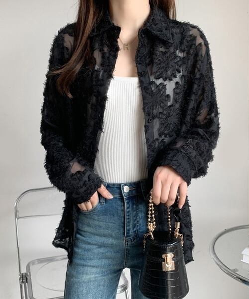 シャツ ブラウス シアーフラワージャガード 長袖 トップス 花柄 シアーシャツ 透け感 ボタン 黒 ホワイト