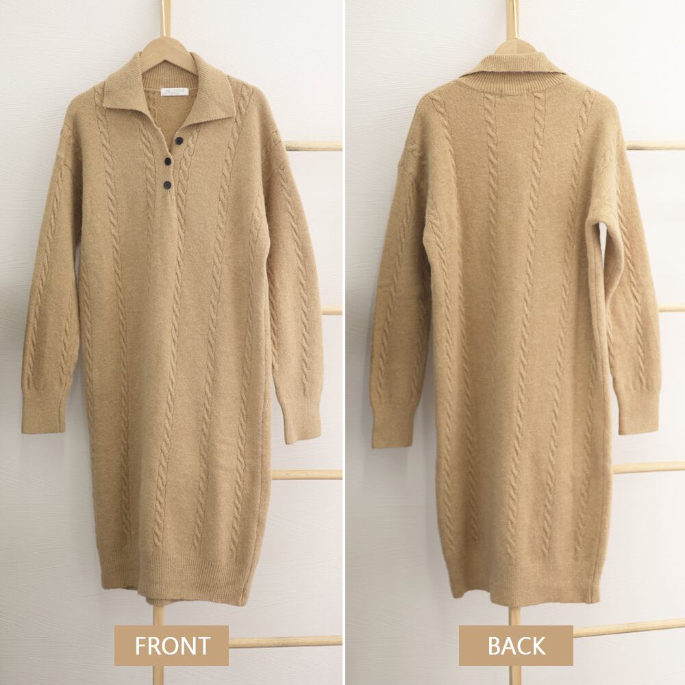 ふんわりとした心地よい肌触り、リラクシーなシルエットが抜け感を演出してくれるケーブル編みロング丈ニットワンピース