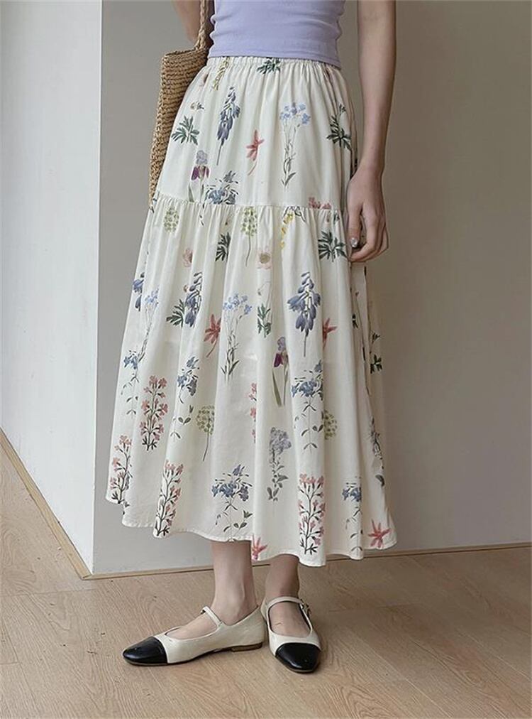 韓国風ビンテージスカート フラワーAライン プリーツロング