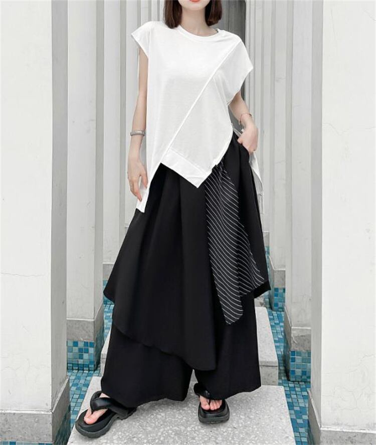ゆったり気品カジュアル 縦縞切り替えワイドパンツ