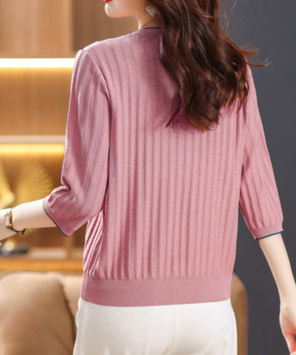 マルチリブ編みがおしゃれ、クルーネックデザインの七分袖ニットトップス。