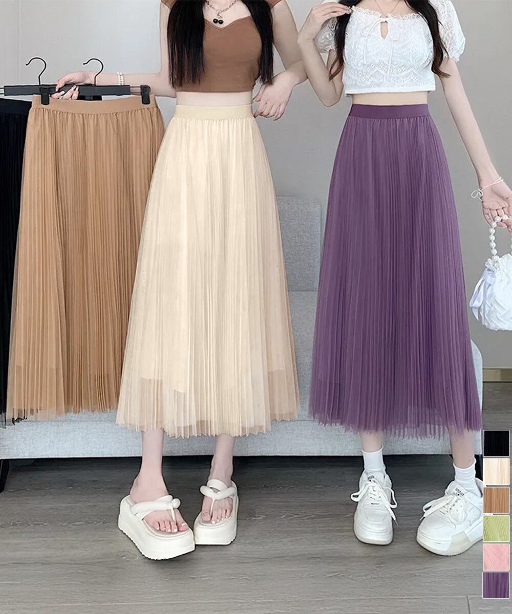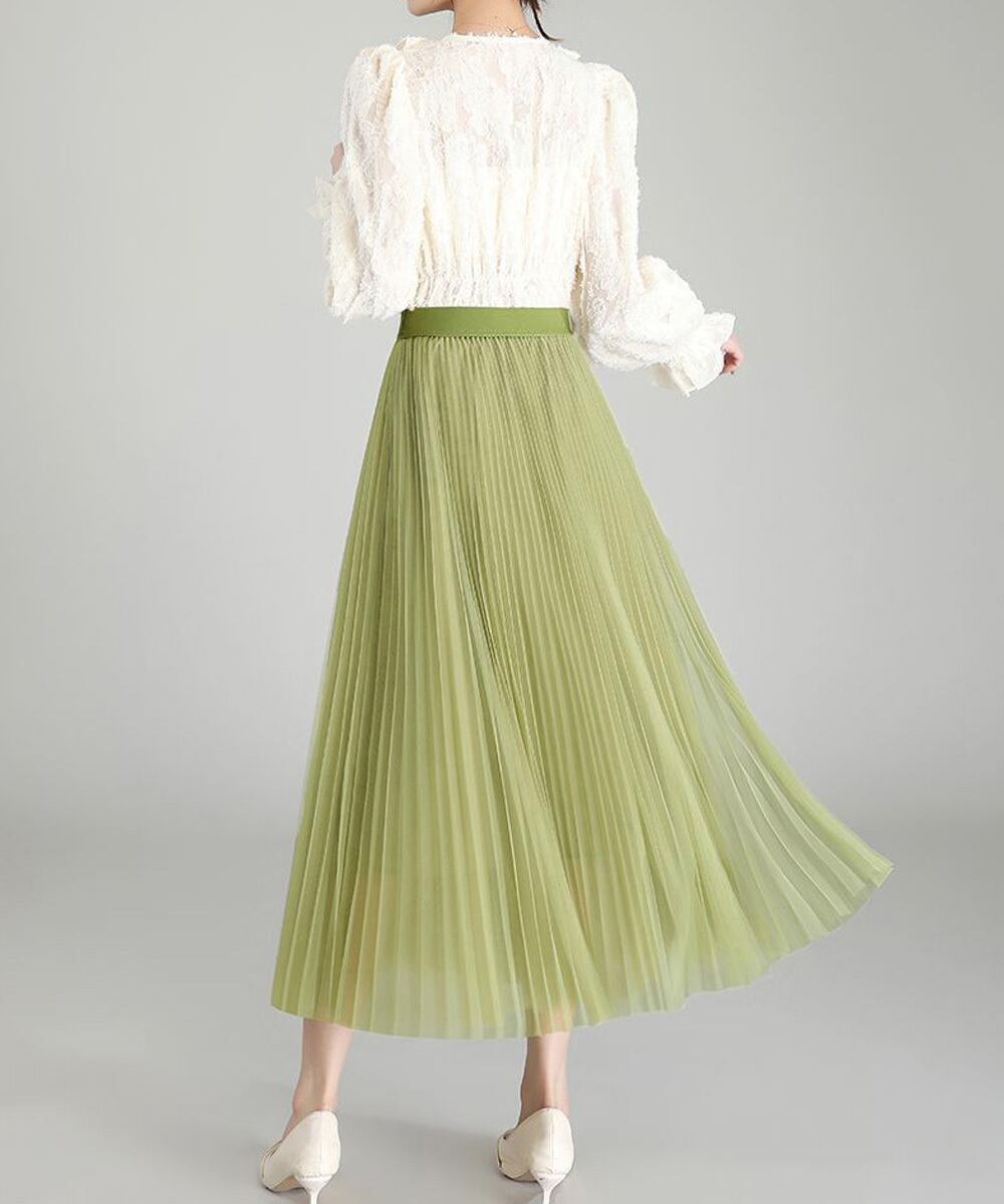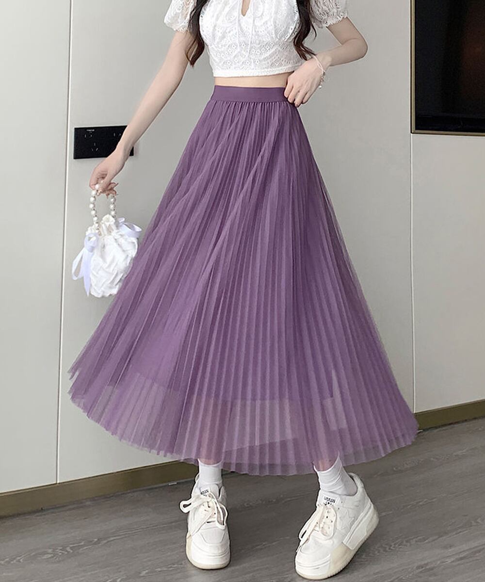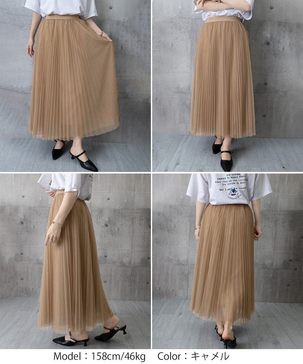 軽やかなチュール素材を使用した、プリーツデザインのロングスカート。