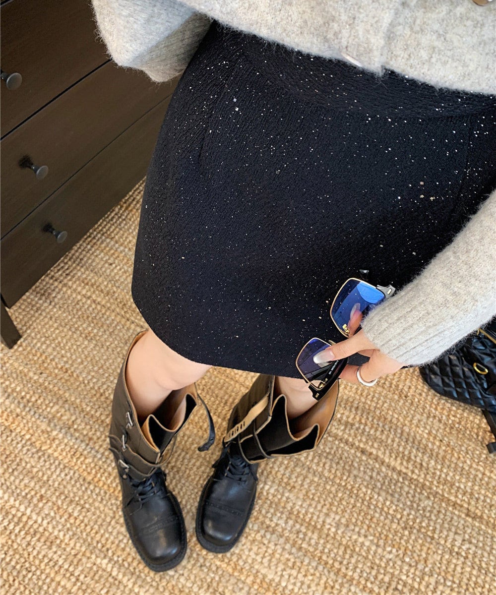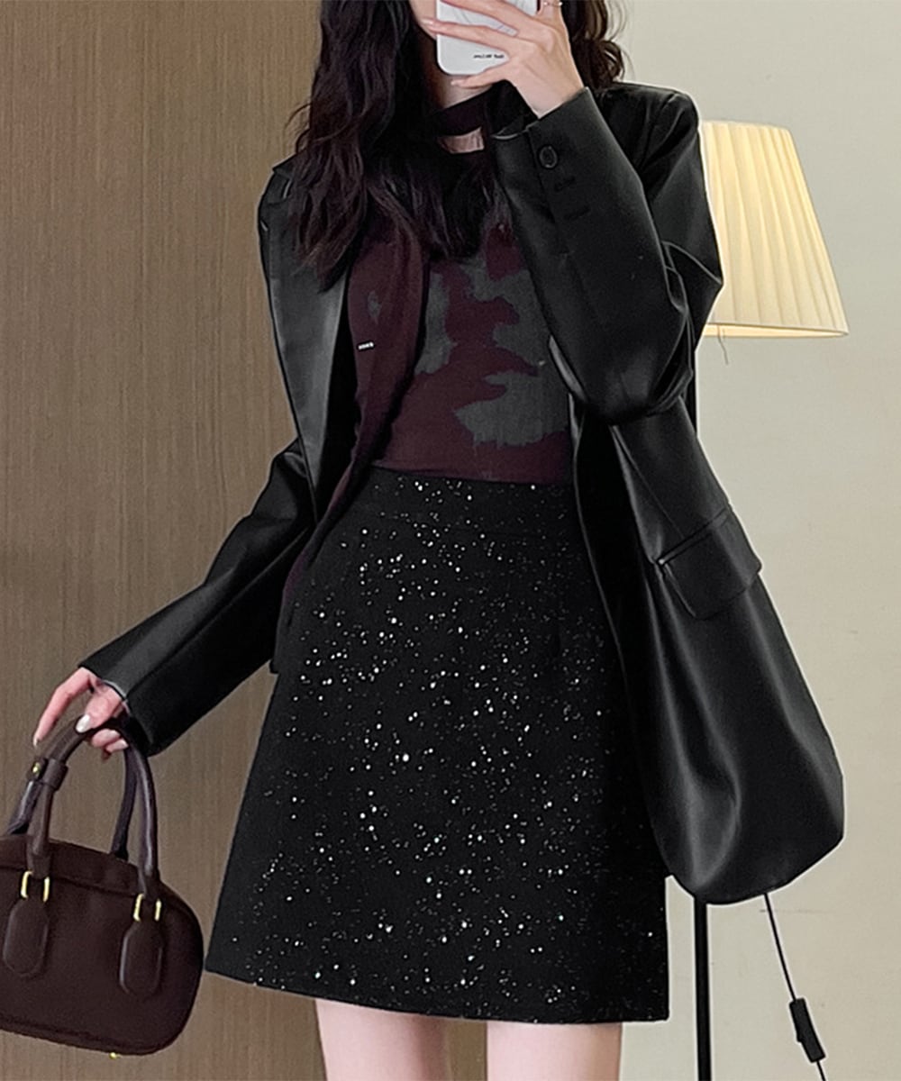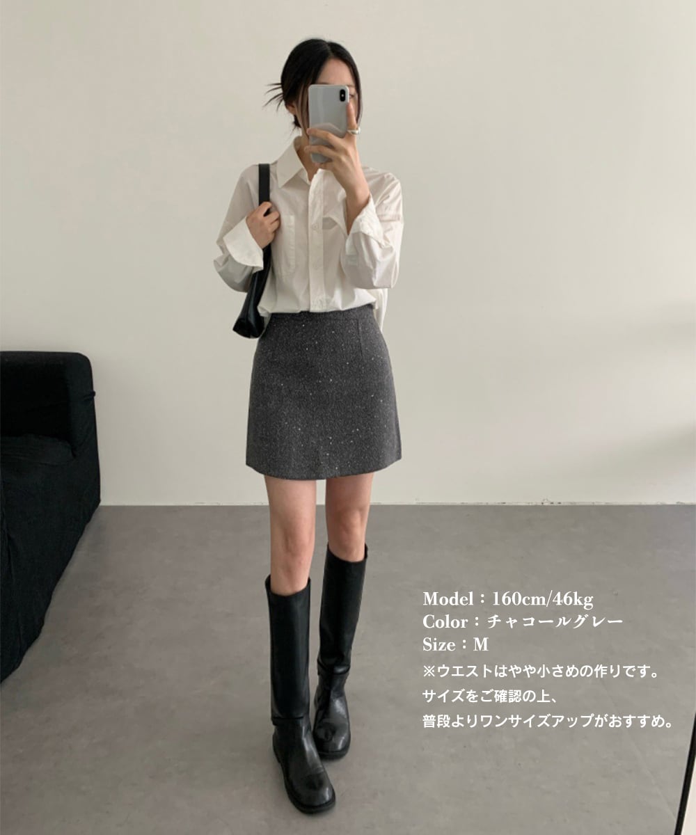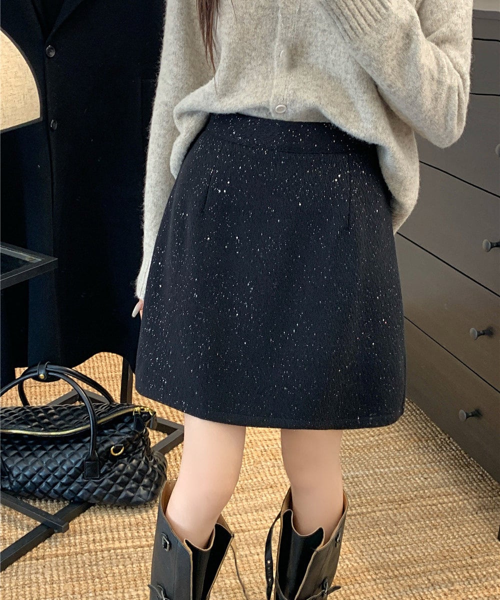 ラメ感のある生地がさりげなく上品な印象のミニスカート。